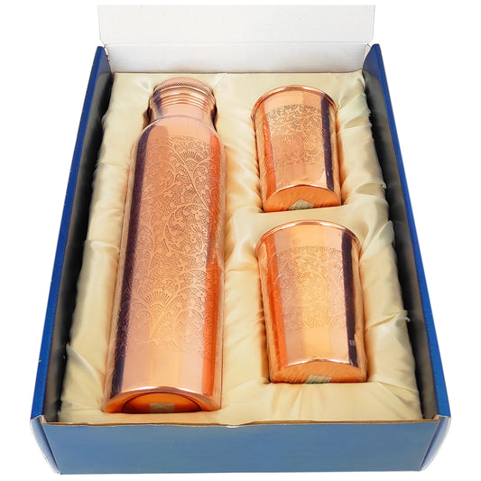 Pure Copper Drinkware Gift Set of 2 Glass and 1 Bottle in Embossed Design